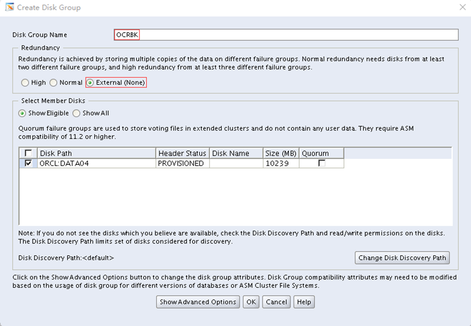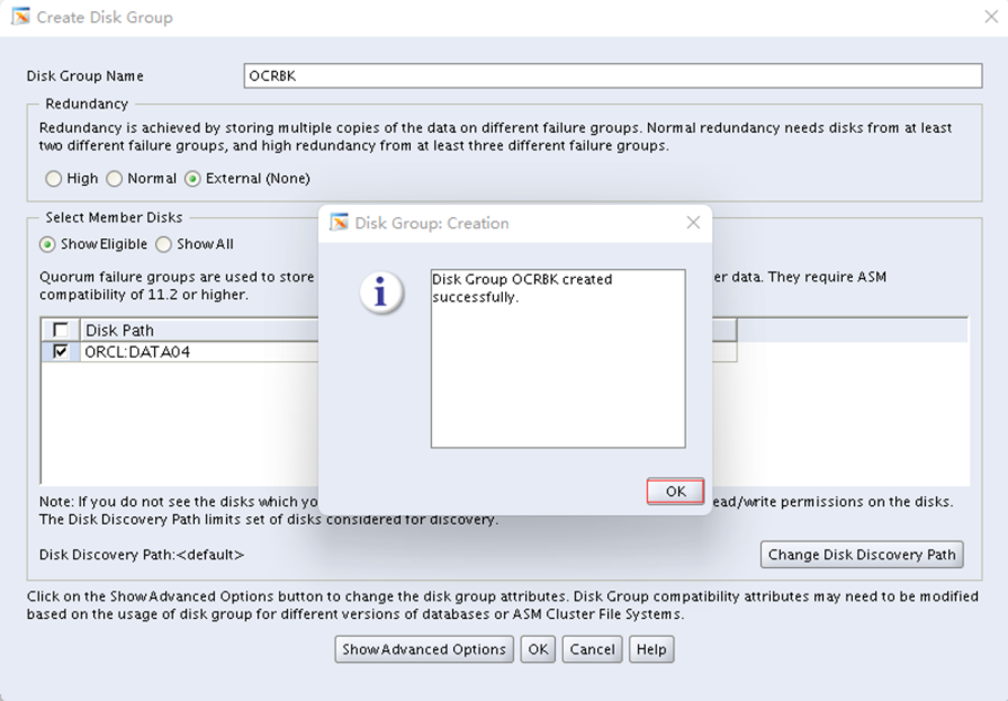 开启xmanager,节点1创建新磁盘组ocrbk.