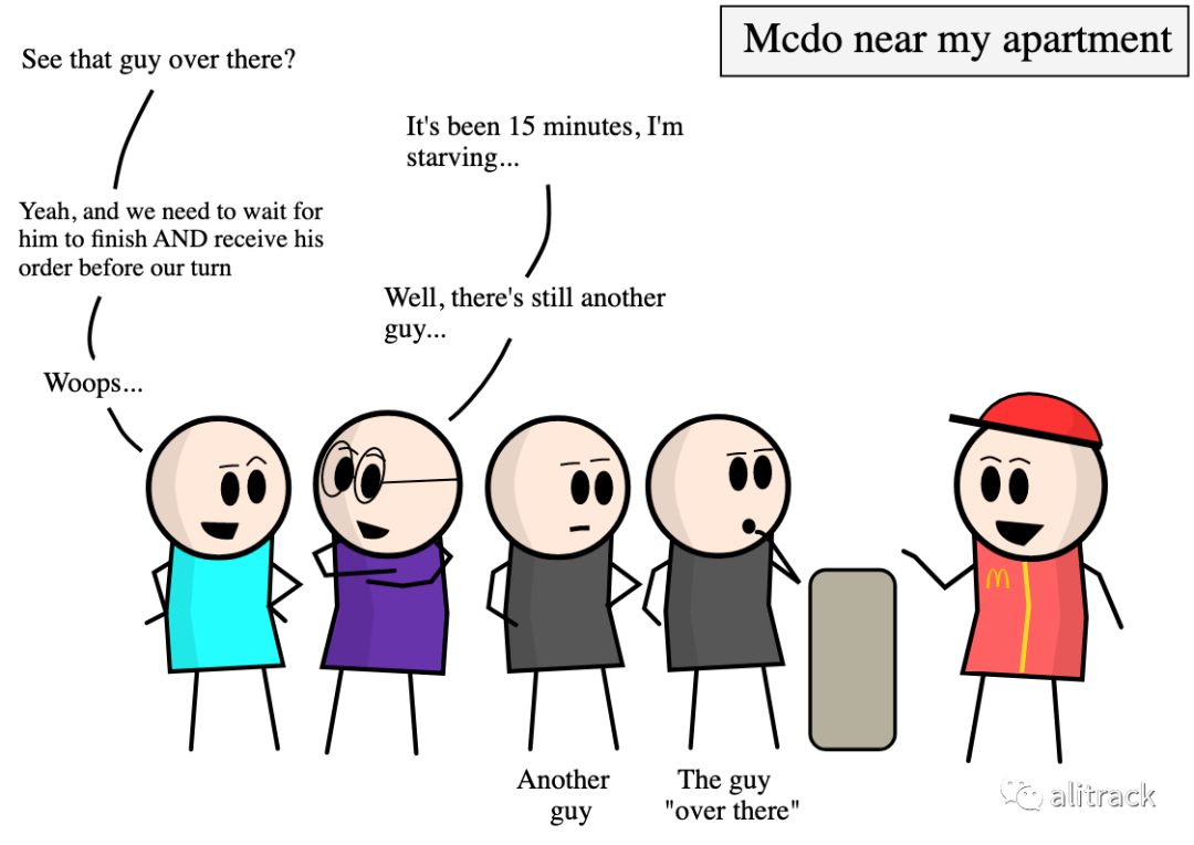 在我公寓附近的 Mcdo:我需要等待在我之前排队的每个人都完成并收到他们的订单,然后我才能开始我的订单。