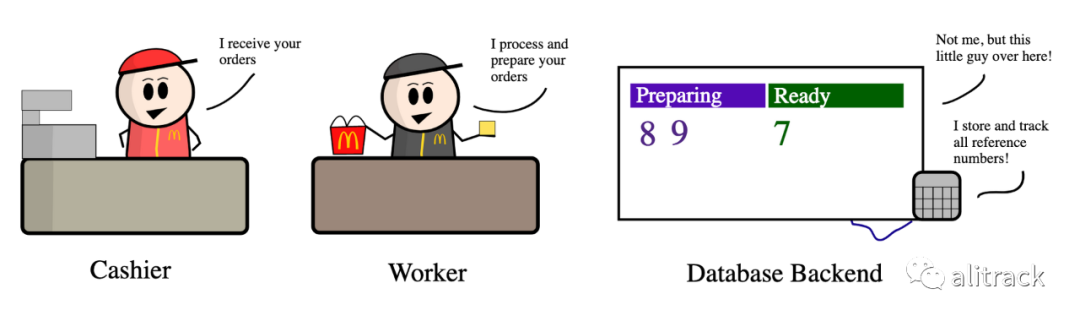 收银员:他们负责与客户交谈、接单并提供参考编号(请记住,在我们公寓附近的 Mcdo 中,他们也是准备餐点的人,效率低下)。 工作人员:他们是接收订单并准备或烹饪我们餐点的人。 LED 屏幕背后的数据库:LED 屏幕显示客户的参考号和订单状态的信息,但我们知道它的工作只是显示信息。真正的主力是它背后的数据库。可以把它想象成一个巨大的、隐形的桌子,可以存储 LED 屏幕显示的任何内容。总而言之,我们通过下图看到这些组件相互关联: