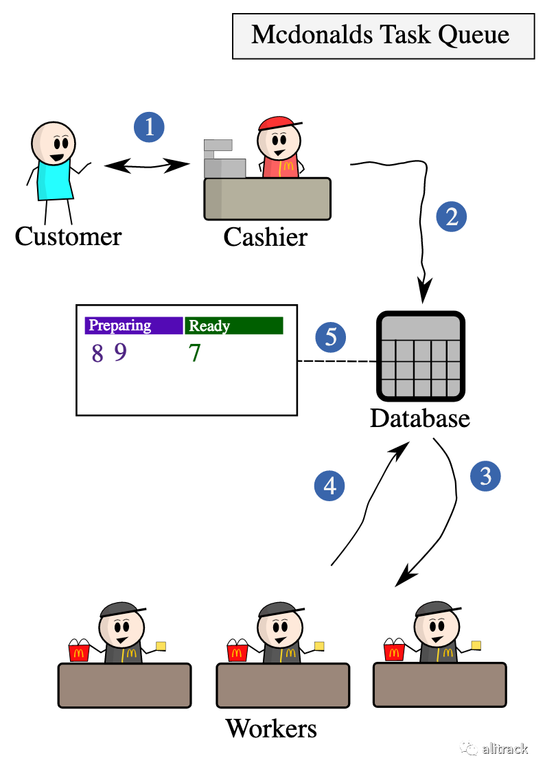 状态),以便空闲的工人可以接受他们。客户收到一个参考编号并坐在一边。然后收银员可以自由地接受另一个订单。一名空闲下来的工作人员接受订单并准备餐点。 工人完成准备后,他将参考编号的状态从 PENDING