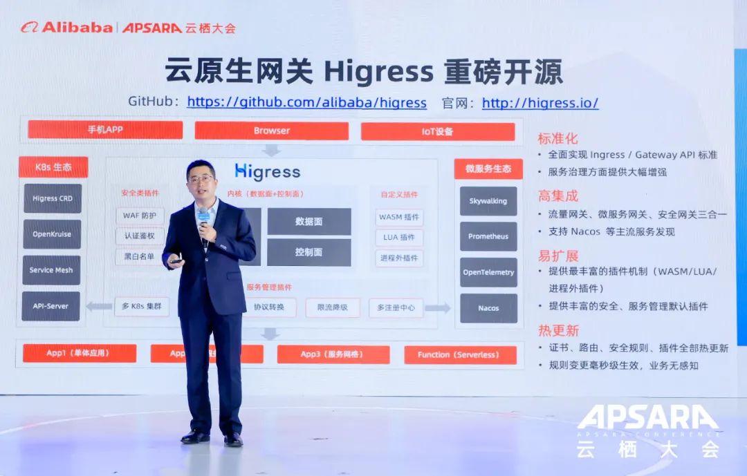 11月5日,2022 杭州 · 云栖大会-云原生峰会现场,阿里巴巴研究员、阿里云智能云原生应用平台总经理丁宇宣布:云原生网关 Higress 正式开源,Higress 是一款标准化、高集成、易扩展、热更新的云原生网关。