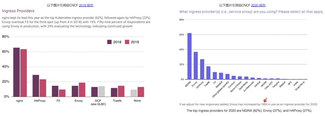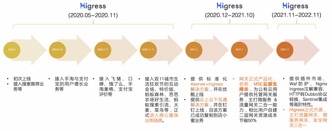 Higress 的创建源于阿里内部的“本地生活战役”,该战役始于“支付宝 2020 合作伙伴大会”,在此大会上支付宝宣布升级为数字生活开放平台。该战役的核心技术目标,是实现阿里巴巴业务域与蚂蚁业务域之间 RPC 直接调用,但因阿里巴巴与蚂蚁业务域网络是隔离的,即网络是不通的,很自然想到利用网关来解决此问题。利用网关来解决阿里巴巴与蚂蚁跨业务域 RPC 互通问题,首先要对网关做技术选型。相信大家也都或多或少知道,阿里巴巴开源的反向代理程序 Tengine。Tengine 在阿里内部统一接入网关 AServer 中被使用,我们团队就是负责其开发运维,同时我们团队也在负责阿里巴巴 Service Mesh 的落地,不管是对 Tengine 还是对 Istio + Envoy 这套架构都比较熟悉。在选型时,虽然也调研过一些其他的软件,但考虑到网关对性能、可靠性的高要求,在结合我们自身的网关运维经验,决定看看 Tengine 与 Envoy 是否可以满足我们的业务需求,在对比时我们罗列了四个关键要点,其对比如下:这里提一下“为什么我们认为配置的热更新,是非常重要的”?Tengine/Nginx 的配置更新需要 reload,reload 需要重启 worker 进程,重启时会引起流量抖动,对长连接影响尤为明显。在网关的集群规模非常大时,更是不能随意的做 reload,这时就会引发一个矛盾点:业务向网关提交配置后,希望能快速验证,但受限于 reload 机制和稳定性要求,无法满足业务快速验证与快速试错的诉求。现在已经有很多主流应用选择采用长连接,HTTP 1.1 一般默认会使用 Keep-Alive 去保持长连接,后续 HTTP 2 以及 HTTP 3 也是如此,随着网络协议的发展,未来使用长连接会变得更加普遍。而配置热更新天然对长连接非常友好。一是采用两层网关,即流量网关 + 业务网关;二是实现网关原生支持配置热更新。除了对比不同方案的优劣势,我们也调研了 Envoy 作为网关在业界的趋势,结论是目前 Envoy 作为 K8s 中的 Ingress Provider 增长最快的事实(Ingress Provider 指 K8s Ingress 规范具体实现,因 K8s Ingress 自身只是规范定义,是 K8s 下外部流量进入集群内部的网关规范定义),我们最终选择了 Envoy 来实现两层网关。Higress 从最初社区的 Istio + Envoy,到经历阿里巴巴内部的自研扩展,再到大规模生成验证,最后完成商业化产品的发布,其整个过程介绍如下:下面的章节会对 Higress 的各个阶段做进一步的详细说明。