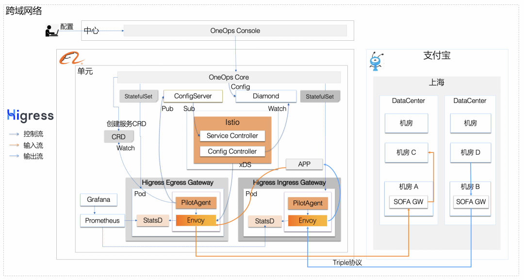 此阶段的大目标是为了满足集团与蚂蚁 RPC 互通,降低全链路的 RT,解决原 s2s 链路因 RT 过高带来的用户体验差及无法满足更多集团与蚂蚁协同场景要求。s2s 链路是走公网链路,协议采用 HTTP。与蚂蚁互通网关的架构图如下,这里以上海云单元为背景说明。上图主要展示的是集团侧的架构,最终采用了 Istio+Envoy 的方案,在部署的时候又分成了出口集群和入口集群。之所以拆成两个集群,一方面是当时两边互访,蚂蚁调集团的流量要远远大于集团调蚂蚁的流量,上下行特别不均等;另一方面是分开之后两个集群可以各自维护,稳定性会更好。Higress 从开始立项到完成第一期研发,网关改造的核心工作差不多两个人投入了一个半月左右,其中还涉及到大量网络、安全等协调部门的工作。Higress 架构并没有完全按照社区方案来设计,社区版本中配置变更和服务发现使用的是 K8s,在阿里内部庞大的服务规模及配置量下社区原生方案不管在稳定性及性能上都无法满足要求,因此阿里这套方案重点对服务发现、配置存储组件做了替换,及优化 xDS 推送性能。Higress 上线后,顺利达成了最初的业务诉求,目前蚂蚁互通网关链路已经成为集团与蚂蚁互通的首选方案,一些支付链路也迁移到了该方案,例如充值中心等,具体达到的成果简述如下:- 蚂蚁调用集团链路相比原链路 RT 降低 50%,网关自身 RT 0.3ms。