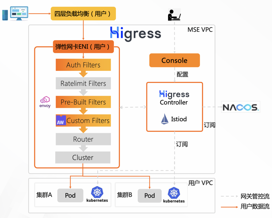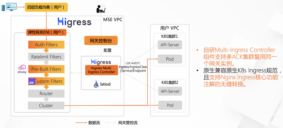 随着阿里巴巴上云战役的推进,越来越多的场景找到我们。比如云上云下业务互通,由于 Tengine 服务管理弱导致阿里内部大量二层微服务网关需要收敛,这就需要从业务上做 Tengine+Envoy 两层网关的演进,承担南北向网关流量。在 2020 年 12 月份,团队开始了 Higress 架构的继续演进,以优酷场景为例的演进过程如下图:在两层架构中,Higress 网关更多承担了微服务网关和微服务治理的需求,和 Tengine 流量网关完成了整合。在这个过程里,团队支撑优酷内部多个二层微服务网关统一的工作,大幅提升了性能和运维效率。在这一阶段,Higress Gateway 实现了东西向、南北向全域流量的调度分发,东西向上不仅支持跨业务域的蚂蚁 RPC 互通,也扩展到了混合云的云上云下 RPC 互通场景,覆盖钉钉文档、阿里视频云、达摩院的店小蜜、智慧数字人等。该阶段的业务大图如下(云上云下互通场景,以钉钉为例说明):随着 Higress Gateway 覆盖的业务场景越来多,在跟优酷持续合作的过程中,双方团队不约而同提出了一个设想:Tengine Gateway(承担流量网关角色) + Higress Gateway(承担微服务网关角色)的两层网关是否可以合并为一层 Higress Gateway?我们对这一想法做了调研,答案是肯定的,并且当时大家也合作设计了新的架构方案,如下图:虽然由于各种各样的原因,这个方案最终没有跟优酷继续往下推进。但这个演进方向让团队明确了网关新的发展趋势:在以 K8s 主导的容器化背景下,由于 K8s 集群内外网络的天然隔离性,用户需要一款兼顾高性能与安全性,以及强大服务治理能力的入口网关。这也为后续团队将技术沉淀变成云产品、推进 Higress 的诞生打下了基础。2021 年,阿里巴巴开启了中间件三位一体战役,目标是用云产品支撑集团业务。我们开始将孵化成熟的 Higress 技术沉淀为云产品,即目前阿里云上提供的 MSE 云原生网关,一方面面向广大的公有云用户提供托管的网关服务,另一方面也对内服务集团。MSE 云原生网关的技术架构简图如下:随着 Higress 成为云产品服务于更多外部用户,我们逐步发现用户对 Higress 提出了更高的要求,其中反馈较多的大的需求点是插件扩展、Waf 防护、多注册中心、Nginx Ingress 注解兼容以及 HTTP 转 Dubbo 协议,当然也有很多小的需求点在此就不一一列出,因此该阶段我们重点发力在上述用户反馈的高频需求。