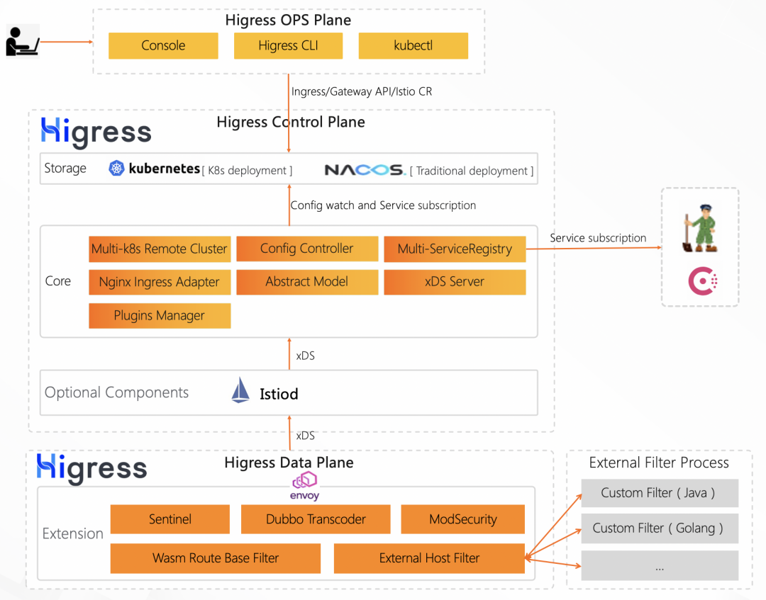 Higress 源自阿里巴巴内部电商、交易等核心生产场景的实践沉淀,遵循 Ingress/Gateway API 标准,将流量网关、微服务网关、安全网关三合一,并在此基础上扩展了服务管理插件、安全类插件和自定义插件,高度集成 K8s 和微服务生态,包括 Nacos 注册和配置、Sentinel 限流降级等能力,并支持规则变更毫秒级生效等热更新能力。