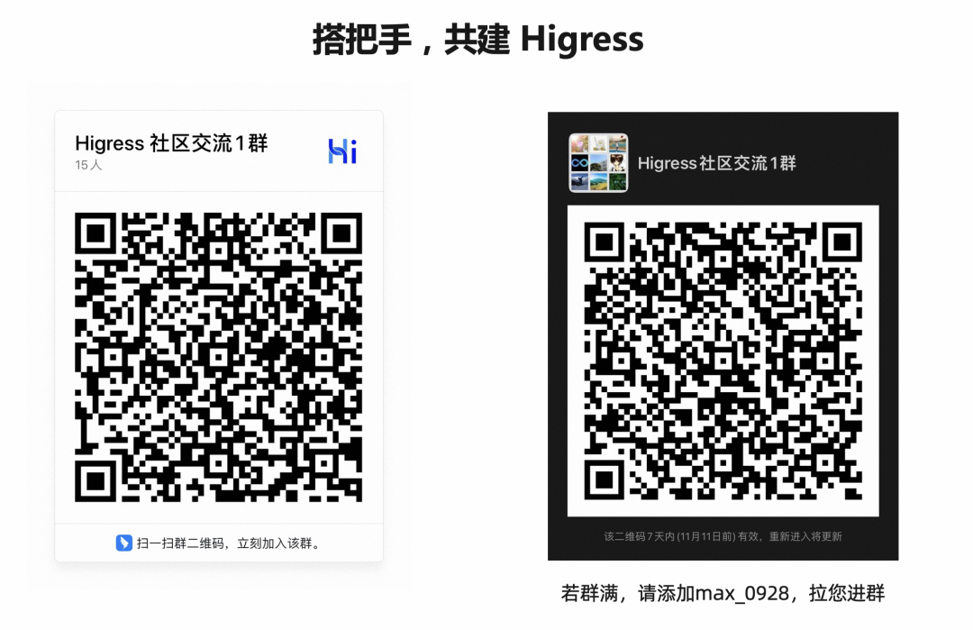 在以 Kubernetes 为代表的容器化云原生方向,我们在兼容好现有 Ingress 标准的基础上,会重点发力下一代的 Ingress 标准 Gateway API,利用 Gateway API 带来的契机打通南北向与东西向的全域流量调度,帮助用户使用一套架构架构同时管理外部与内部流量,降低部署运维成本、提升开发及运维效率。国内云原生网关的开源项目并不多,Higress 今天刚开源,看看文章底部的阅读量,您就是这条街 Topxxxx 关注 Higress 的。如果再走近一步,例如贡献一份文档、提交一段代码,您就有可能成为 Higress 的第一批 Contributor 甚至 Committer。目前,我们建立了 1 个钉群和 1 个微信群,加入我们,联系群主或群管,共建云原生网关吧。