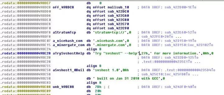 于是,顺手把这个 gpg-agentd 拖到 ida 中,用 string 搜索 bitcoin、eth、 mine 等相关单词,最终发现了这个: