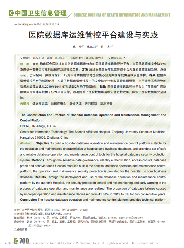 近日,美创科技林江莉与浙江大学医学院附属第二医院(简称:浙大二院)林特、许杰的合作文章《医院数据库运维管控平台建设与实践》在期刊《中国卫生信息管理》发表。