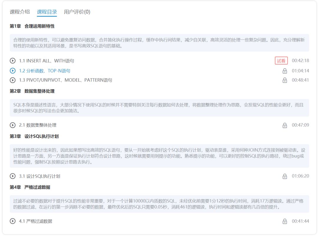 第一,这门课程足够系统和深入,能够让你全面的了解到SQL语句编写引起的问题,从而重视SQL的执行效率。