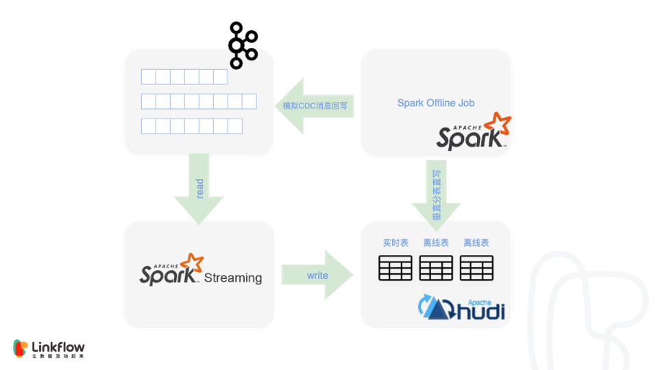 1.垂直分表,即将两部分文件分开,CDC 数据通过 Spark Streaming 写入,离线计算结果写入另一个文件,避免并发写。2.模拟成 CDC 消息回写 Kafka,为了查询性能不能分表的情况下,离线计算结果会模拟成 CDC 消息写入 Kafka,再通过 Spark Streaming 写入 Hudi。但缺点也是很明显的,就是离线任务的结果反映到最终存储的时延较长。