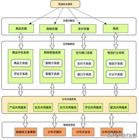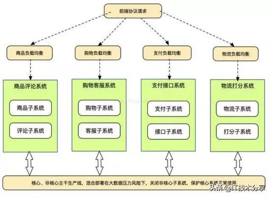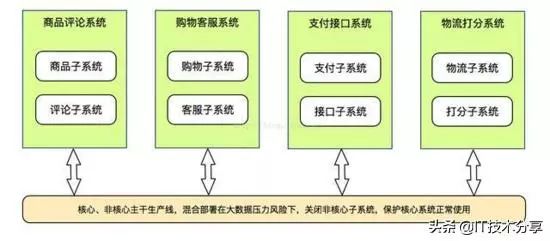 根据业务的需求进行子系统模块划分,可以划分为商品子系统、购物子系统、支付子系统、物流子系统、客服子系统、评论子系统;而非核心需求可拆分出客服子系统、评论子系统及接口子系统。另外,根据各个子系统的核心等级,可拆分出核心子系统和非核心子系统,前者包括商品子系统、购物子系统、支付子系统及物流子系统;后者,则包括评论子系统、客服子系统及接口子系统。需要注意的是一般大型电商平台的物流系统是单独分离出来的系统(入库、出库、库存管理、配送管理及货品管理),而这里划分为子系统的主要目的是为演示核心架构,本架构中物流子系统一般作为对接和管理独立子系统的对接模块哦。