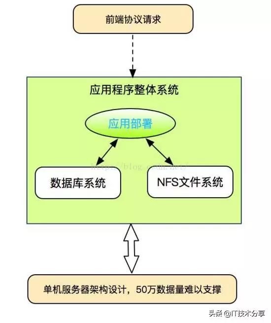 记得很早的时候,很多中小企业所采用的架构设计十分简单,基本使用一台服务器来满足一切需求部署,比如:一台服务器同时用作应用部署、数据库存储以及图片存储等,不料的是待用户数据达到50万以上,系统出现很多性能问题,尽管对数据库和程序做个各种性能优化,结果仍无明显改善,架构如下: