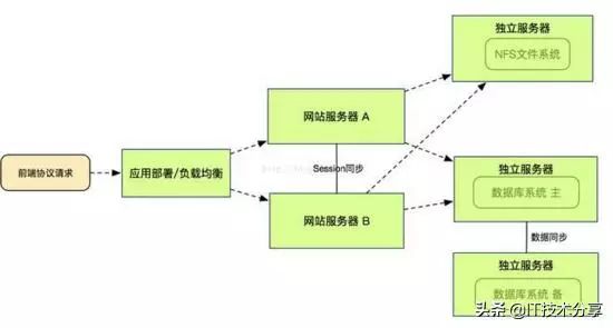 前几年,一般的电商网站的做法是选用三台服务器,一台部署应用,一台部署数据库,一台部署NFS文件系统,做到将各个规模庞大并耗用性能的部分剥离到不同服务器设备,再配备必要的缓存中间件,基本可以满足近1000万的数据量,具体的架构图如下: