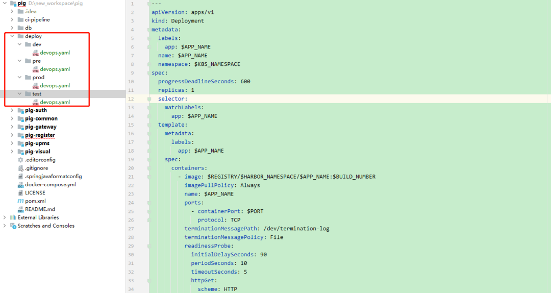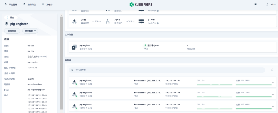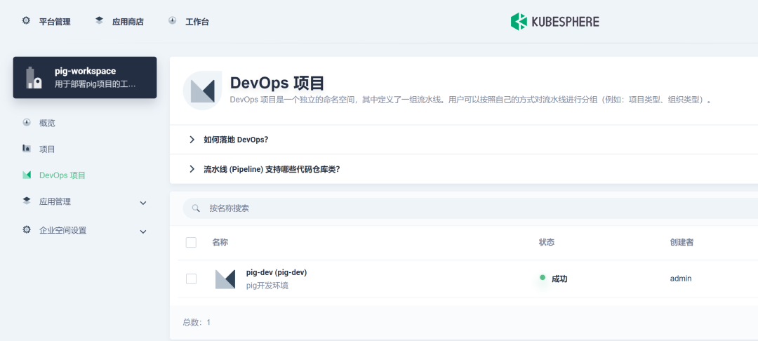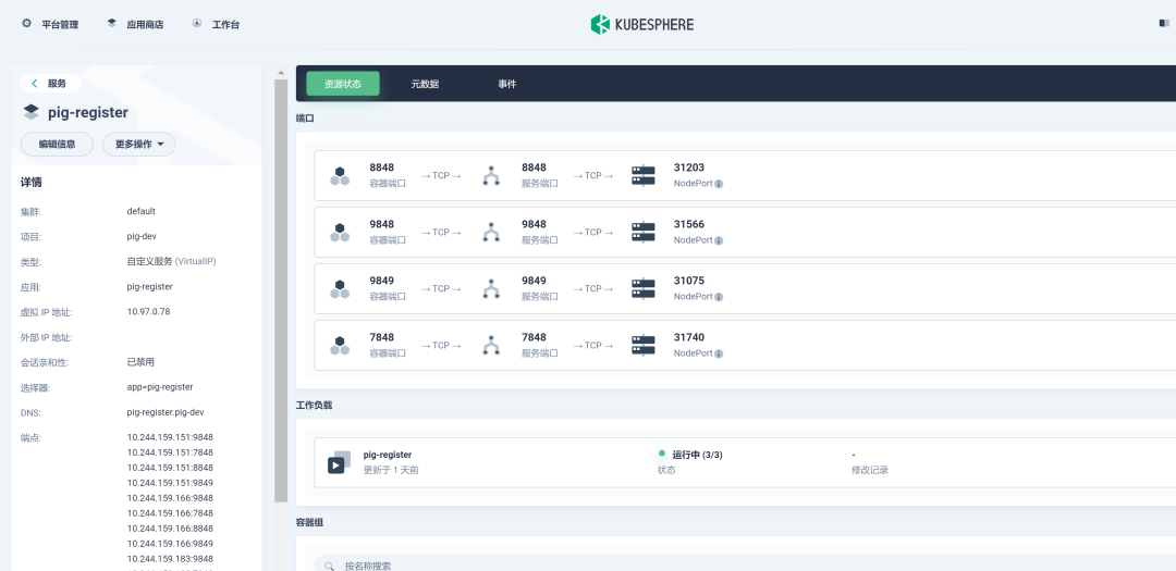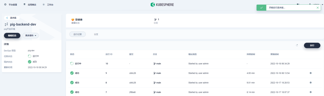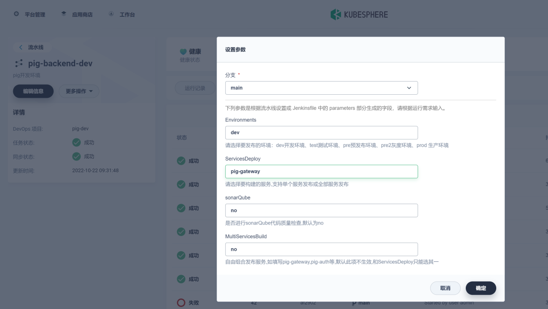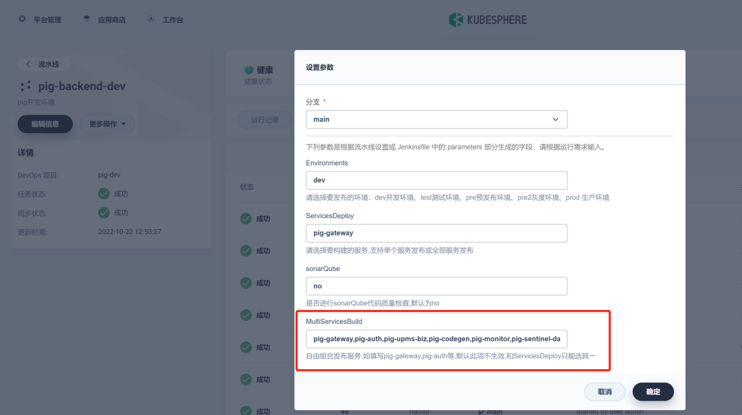 Pig 所依赖的后端微服务为无状态服务。利用 KubeSphere 服务创建 DevOps 流水线项目来部署这些微服务。