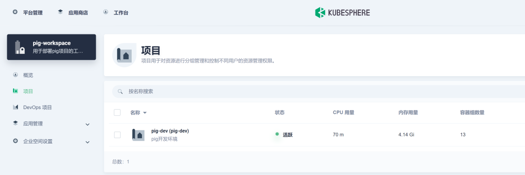 为项目创建一个名称为 pig-workspace 的企业空间 , 企业空间是一个组织您的项目和 DevOps 项目、管理资源访问权限以及在团队内部共享资源等的逻辑单元,可以作为团队工作的独立工作空间。