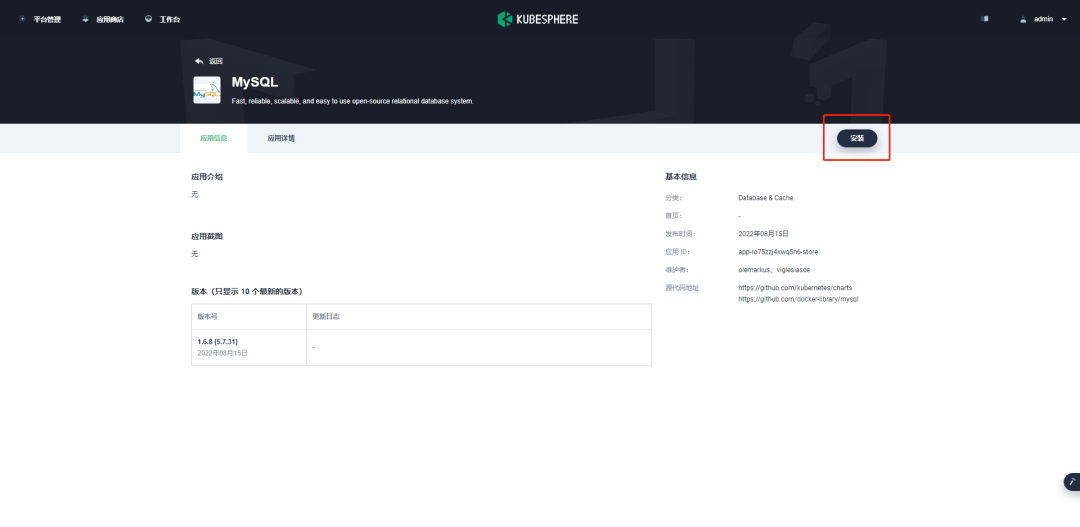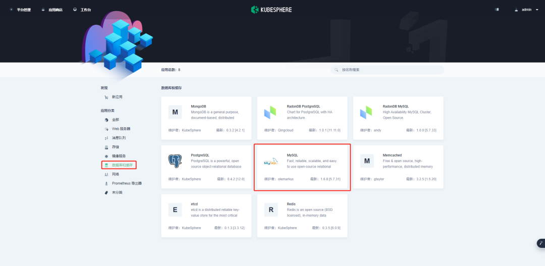 进入应用商店,在应用分类中选择数据库和缓存,找到 MySQL。如下所示: