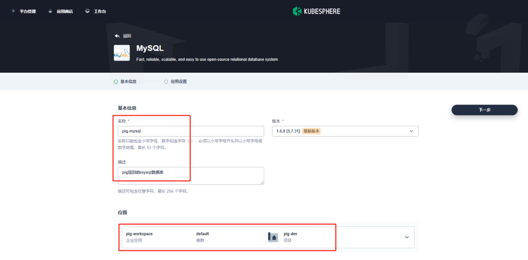 在基本信息中,填写应用名称 pig-MySQL, 并选择位置,进行下一步。如下所示: