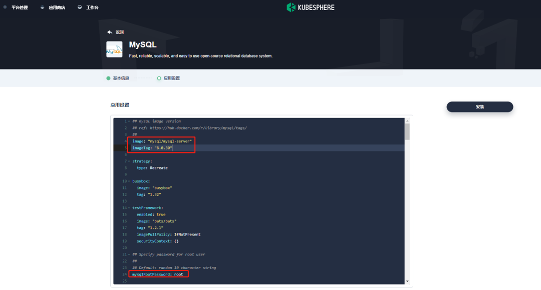 在应用配置中,编辑 yaml 文件 , 将镜像改为 MySQL/MySQL-server:8.0.30,将密码设置为 root。如下所示:
