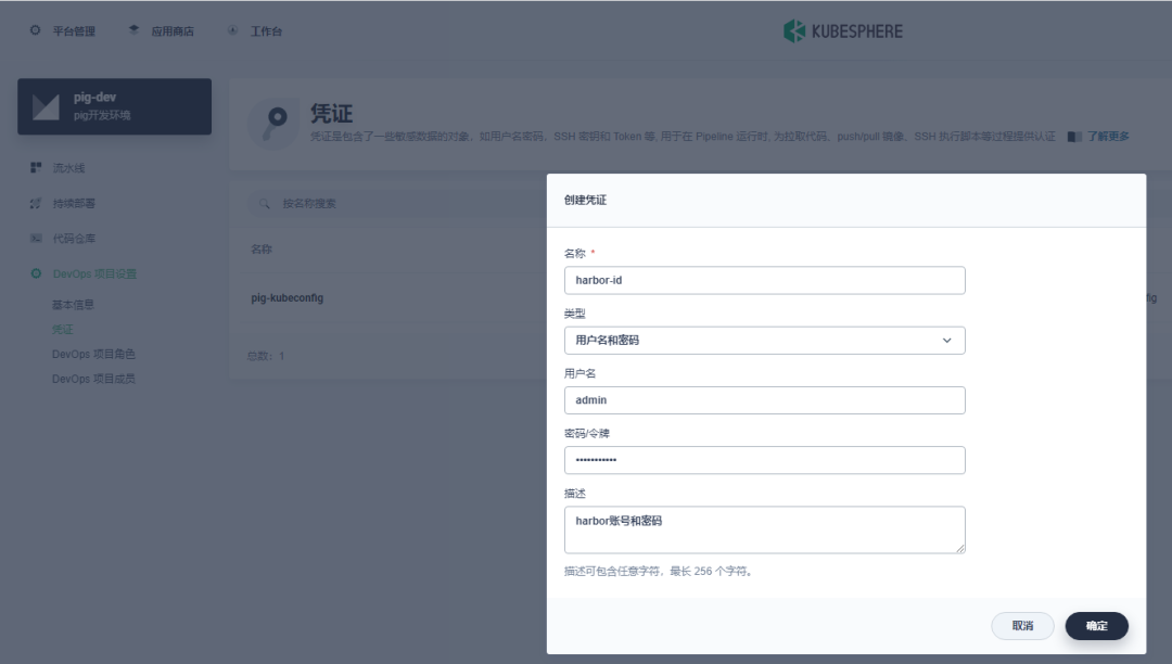 创建 Harbor 凭证 , 如下所示: