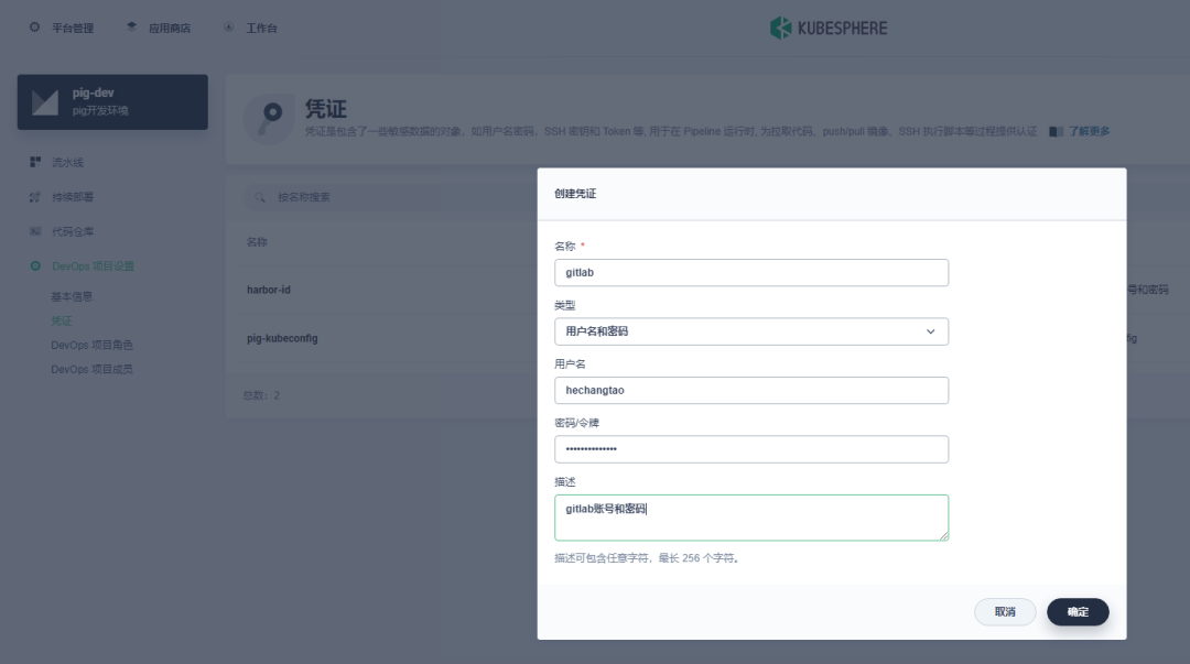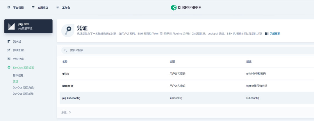 K8s 容器化环境一套,并部署完 KubeSphere v3.3.0 版本,启用 DevOps 插件。搭建高可用的 K8s 集群可参考 👉基于青云 LB 搭建高可用的 K8s 集群、👉青云 LB(负载均衡) 与 K8s 实战(二)。 GitLab 代码仓库管理开源系统一套。 Harbor 容器镜像开源系统一套,搭建可参考 👉Harbor 高可用集群设计及部署。 SonarQube 开源自动代码审查工具一套,搭建可参考 👉SonarQube 实战:部署(一)、👉SonarQube 实战:各种姿势的代码审查(二)(可选,主要用于代码质量检查)。 一个更易于构建云原生应用的动态服务发现、配置管理和服务管理的 Nacos 开源平台一套,搭建可参考 👉基于 Docker 搭建 Nacos 高可用集群(可选,Pig 已提供 Naocs 服务,即 Register 服务)。 高性能的 key-value 数据库 Redis(3.2 +)一套(Pig 需要)。 关系型开源数据库管理系统 MySQL 一套(Pig 需要)。 高性能对象存储 Minio 一套(Pig 中文件上传需要,可选)。或者阿里云、华为云、腾讯对象存储也可。搭建可参考 👉你好,MinIO。
