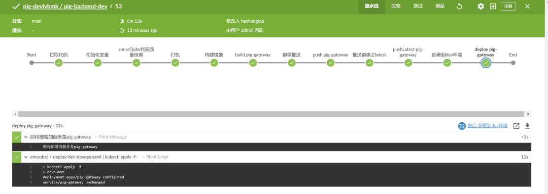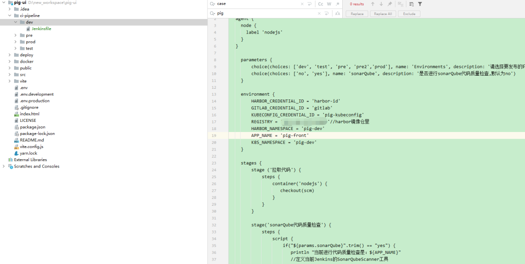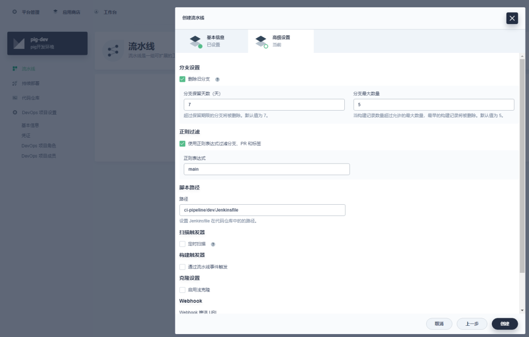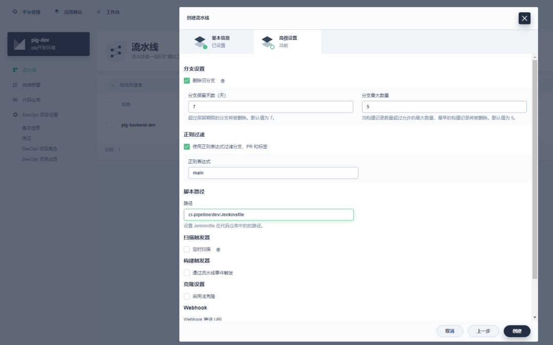 分别创建两条流水线,一条用于构建 Pig 后端 Java 代码,另外一条用于构建基于 Vue 的 Pig-ui 前端代码。