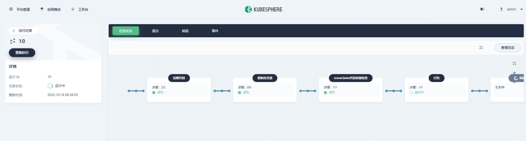 运维人员可通过 KubeSphere 来管理服务,也可以利用 KubeSphere 中的 Jenkins 来发布制品。如下所示: