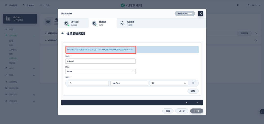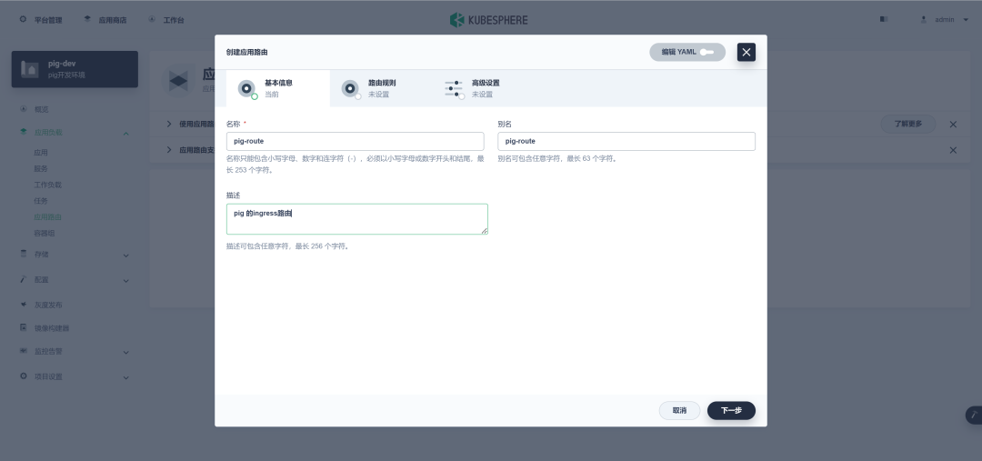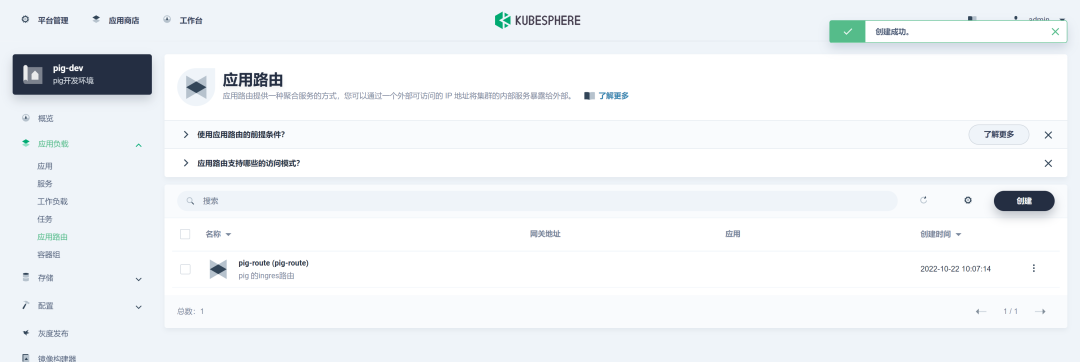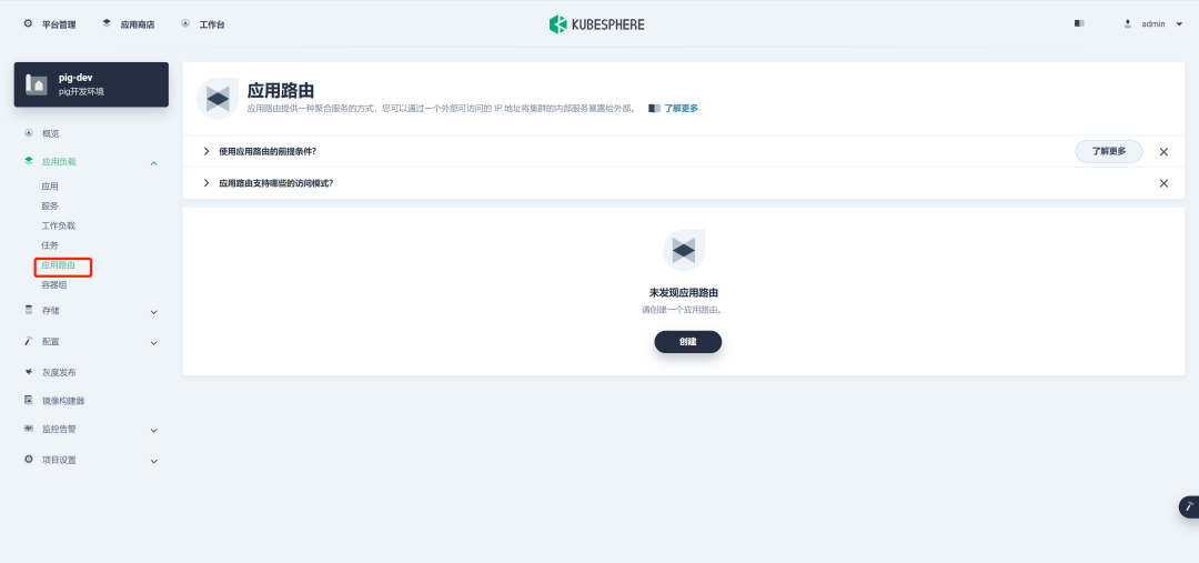 KubeSphere 中应用路由是需要手动创建的,如下图所示: