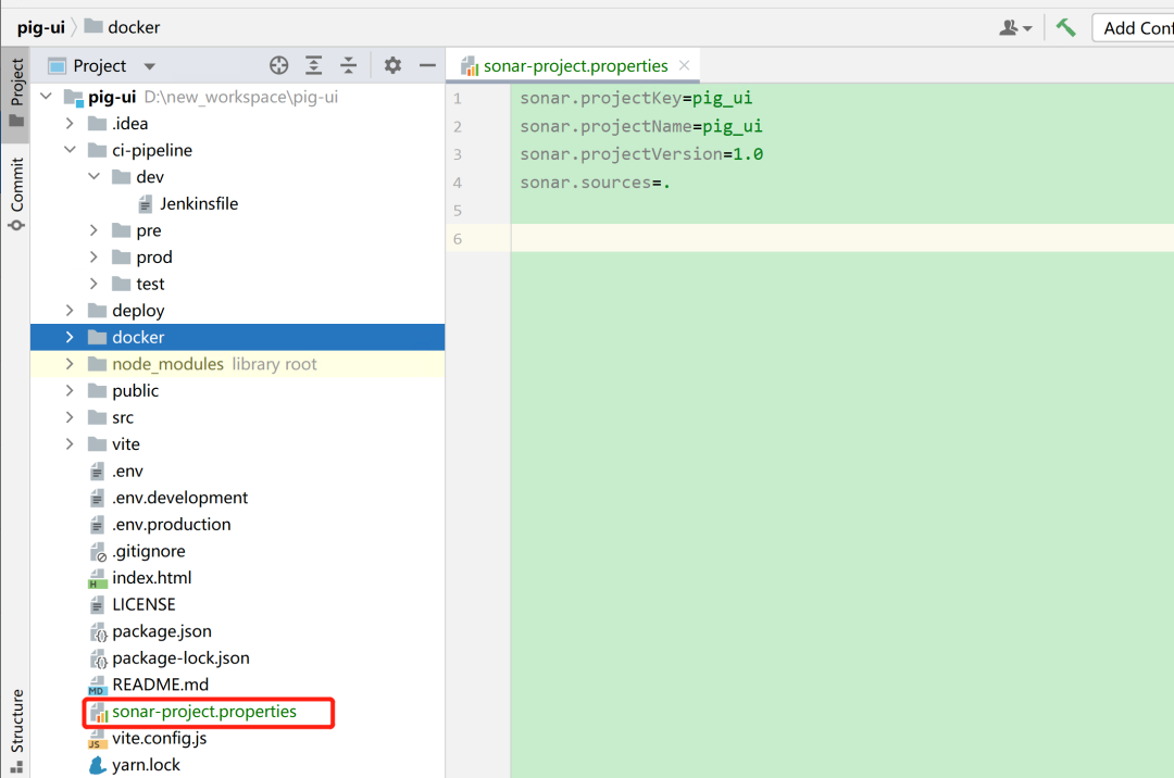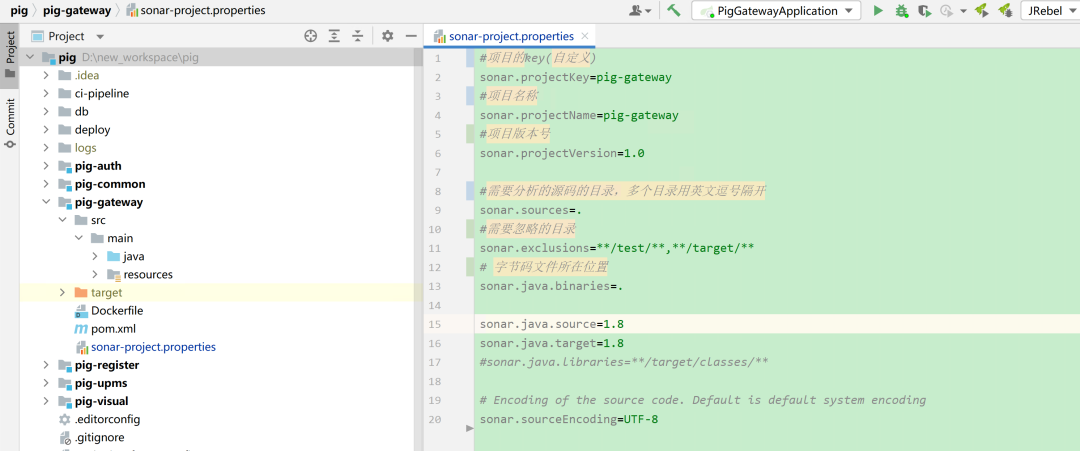 以 pig-gateway 为例,在 pig 项目中新增 sonar-project.properties 文件。