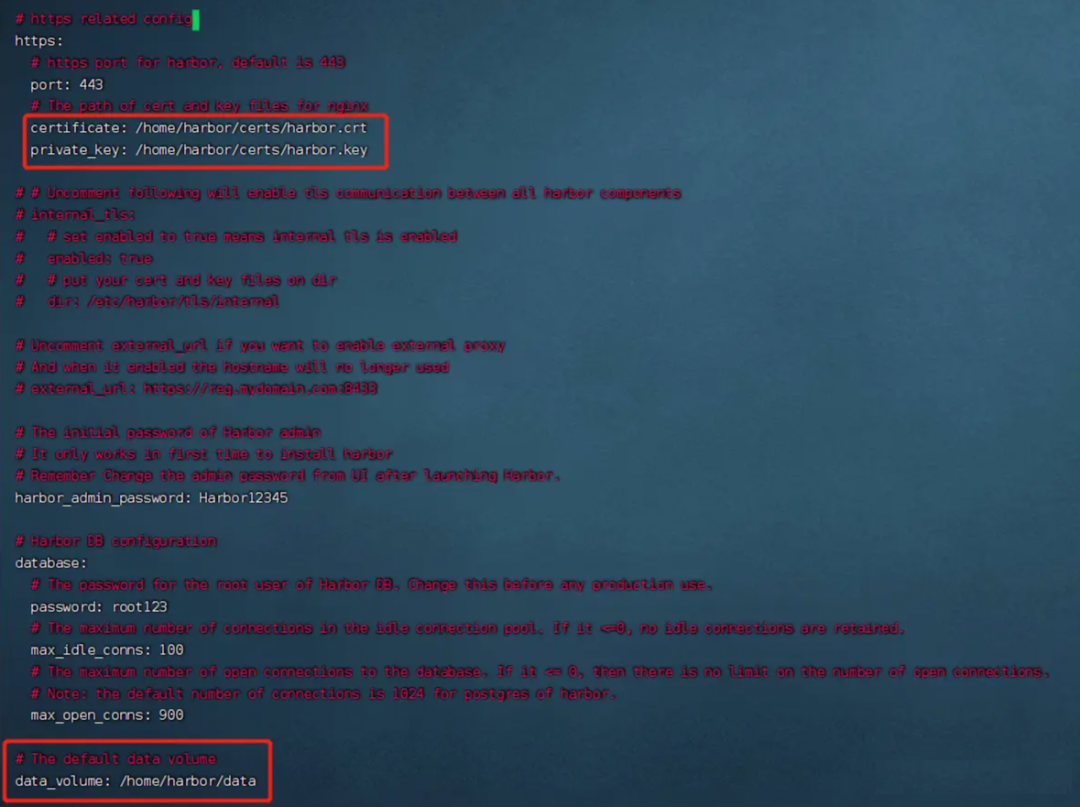 修改下图内容的配置,一个是配置 https 证书,一个是配置 data 数据目录。hostname 参数