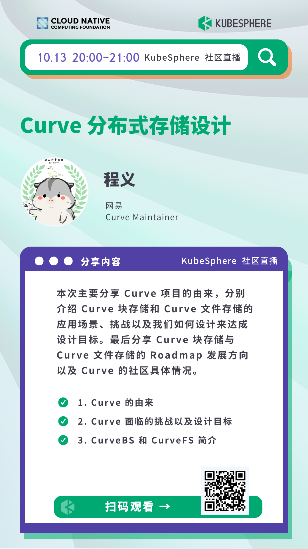 本次主要分享 Curve 项目的由来,分别介绍 Curve 块存储和 Curve 文件存储的应用场景、挑战以及我们如何设计来达成设计目标。最后分享 Curve 块存储与 Curve 文件存储的 Roadmap 发展方向以及 Curve 的社区具体情况。