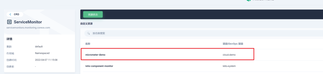 执行成功后可以在集群的 CRD 下面搜索 ServiceMonitor 并打开可以找到我们部署的 ServiceMonitor 配置。如图所示:
