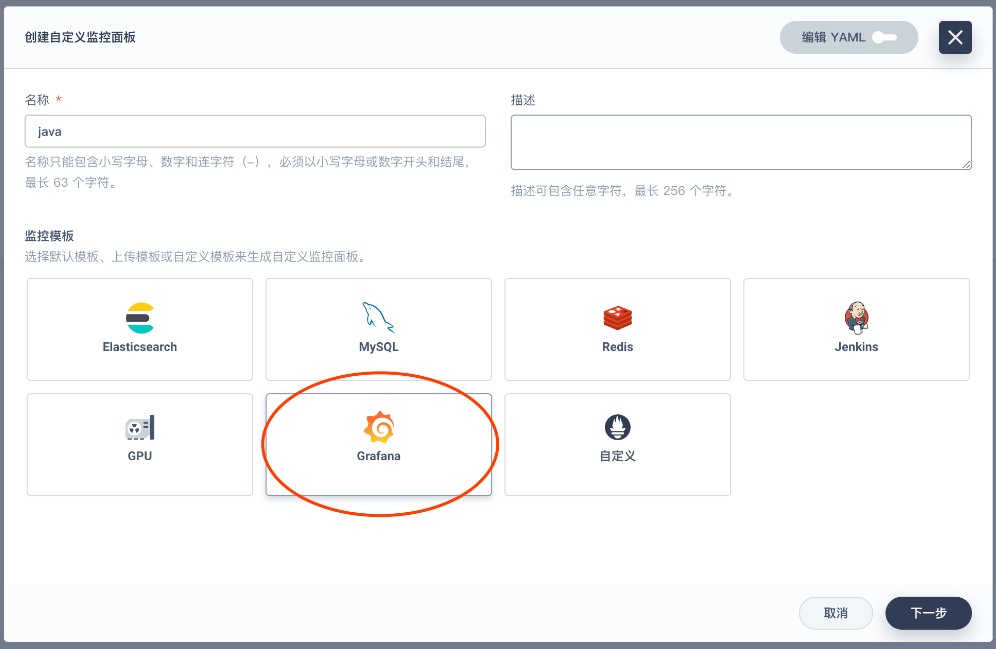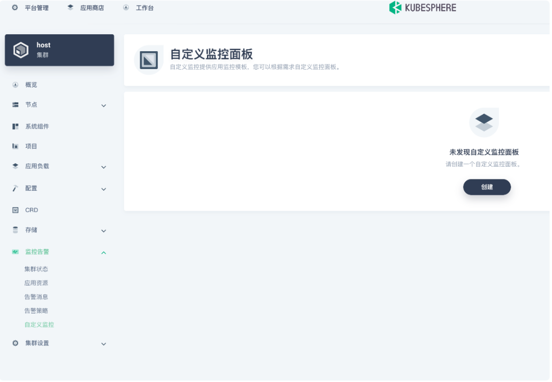 我们点击创建可以看到 KubeSphere 已经集成了部分监控面板,这里我们选择 Grafana。