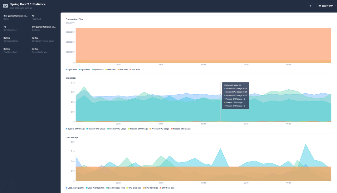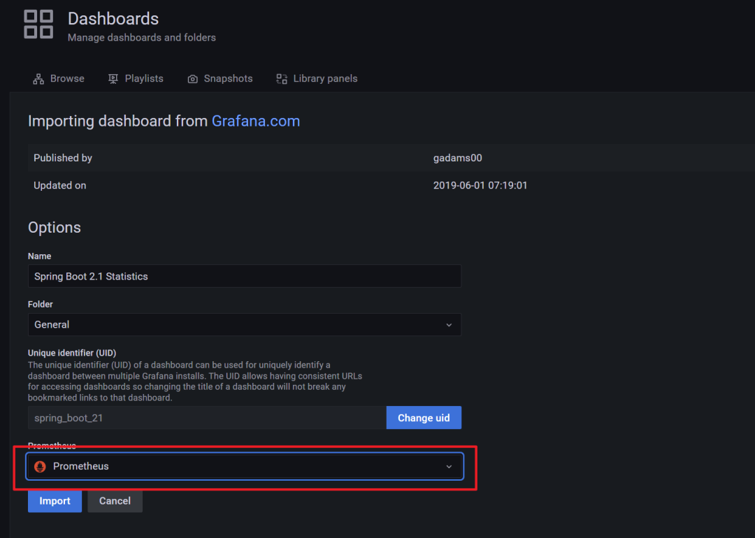 我们点击页面左侧➕-import; 输入我们从 grafana 官网[3] 获得的对应的模版的 id 点击 load(我这里使用的是 Spring Boot 2.1 Statistics | Grafana Labs[4]); 在下一步中选择 Prometheus 为我们配置的数据源 点击 import 即可。