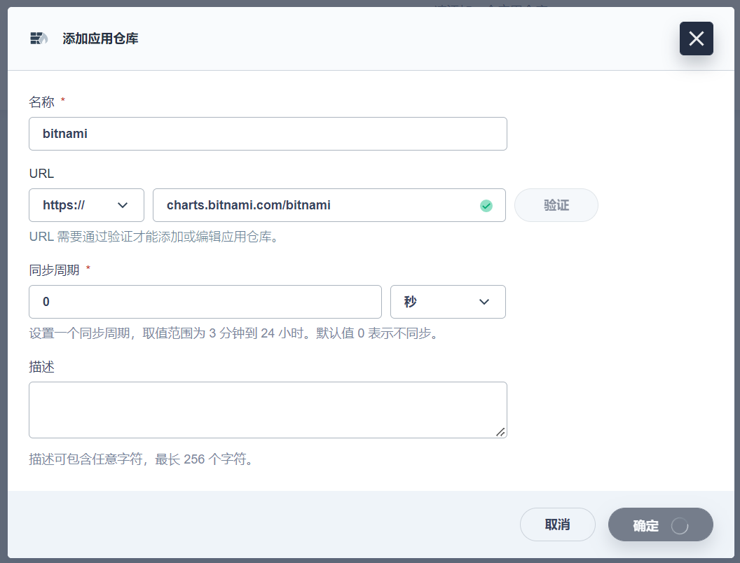 进入企业空间 -> 应用管理 -> 应用仓库,点击添加,加入 bitnami 应用仓库。