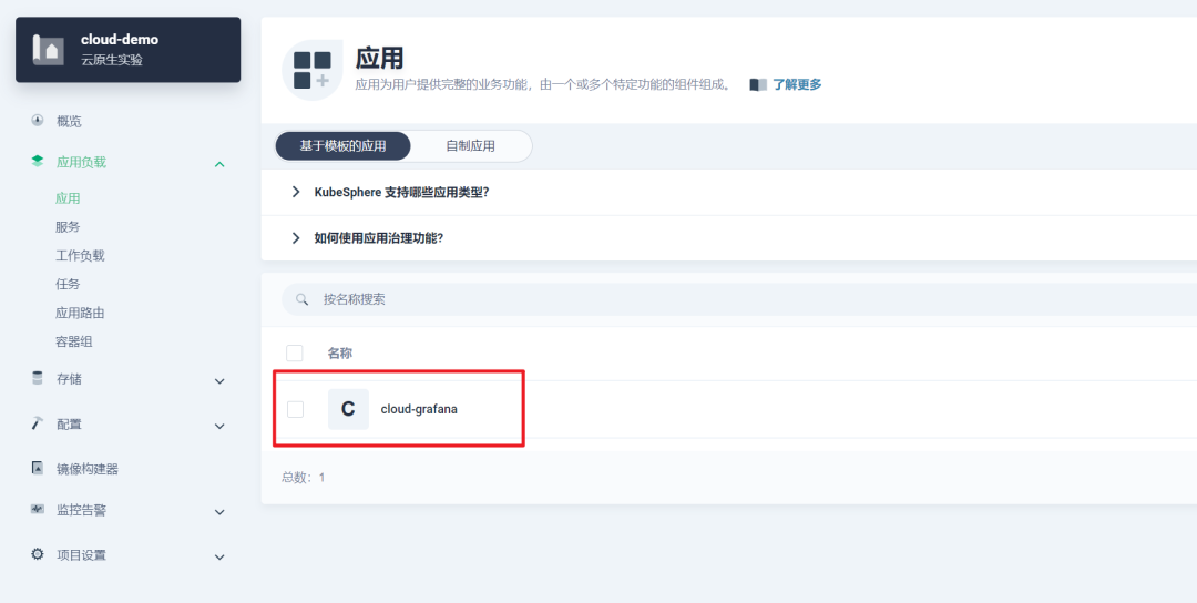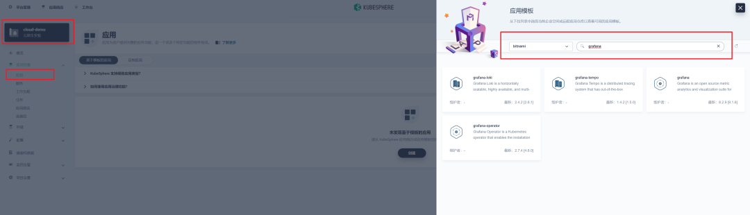 为了方便,我们直接使用 KubeSphere 提供的应用商店功能安装外部 Grafana。