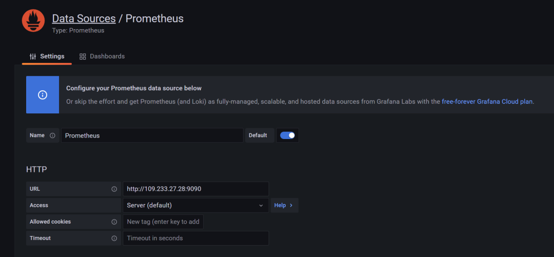 中找到;登录后我们点击左侧的小齿轮-datasource 在打开页面中选择 Add data source 然后选择 Prometheus 在 URL 中填入我们上面说到的 Prometheus 的 URL 地址。如图所示: