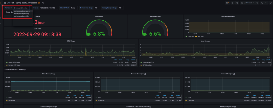 使用这种方式有个最大问题就是多个应用无法切换,像我们之前部署了 3 个应用在一张图中显示就很乱,所以需要通过外部 Grafana 展示监控数据。