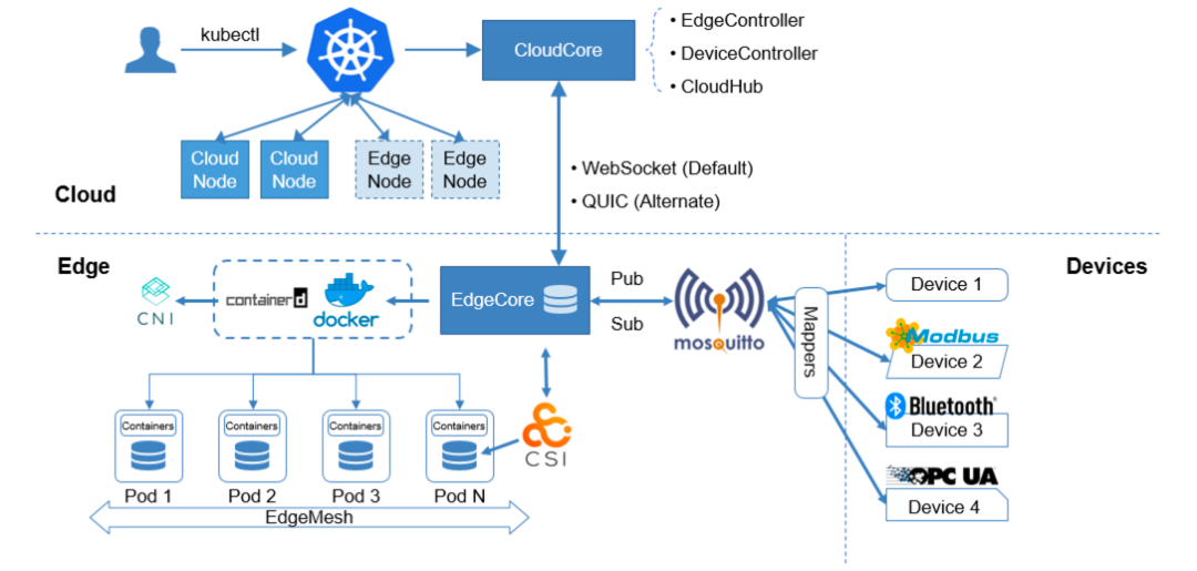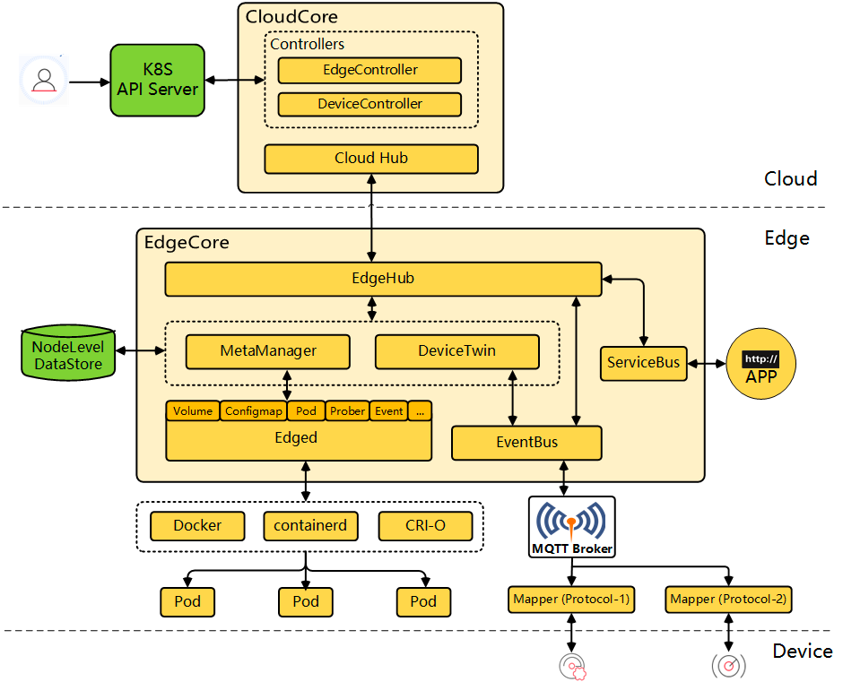 KubeEdge 是 K8s 在边缘场景下的延伸。目标是将 K8s 对容器编排的能力延伸到边缘上;KubeEdge 主要包含两个组件,云端的 CloudCore 和边缘节点上 EdgeCore,同时还有一个 Device 模块,用于管理海量的边缘设备。