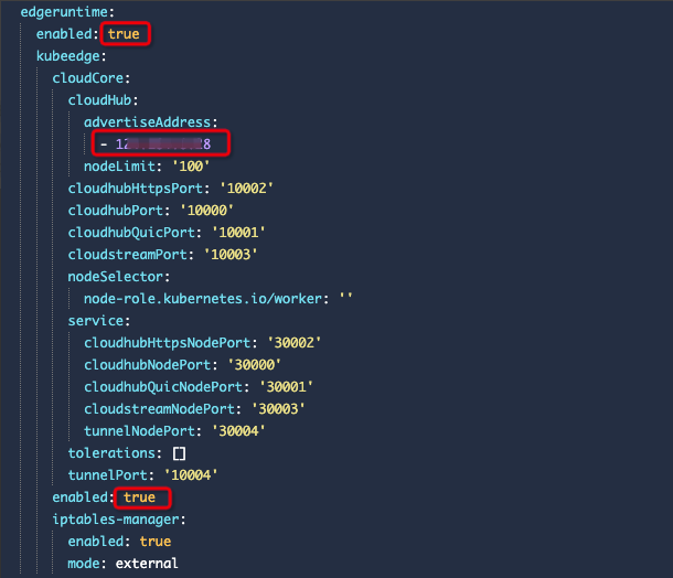 ;修改 edgeruntime.kubeedge.cloudCore.cloudHub.advertiseAddress