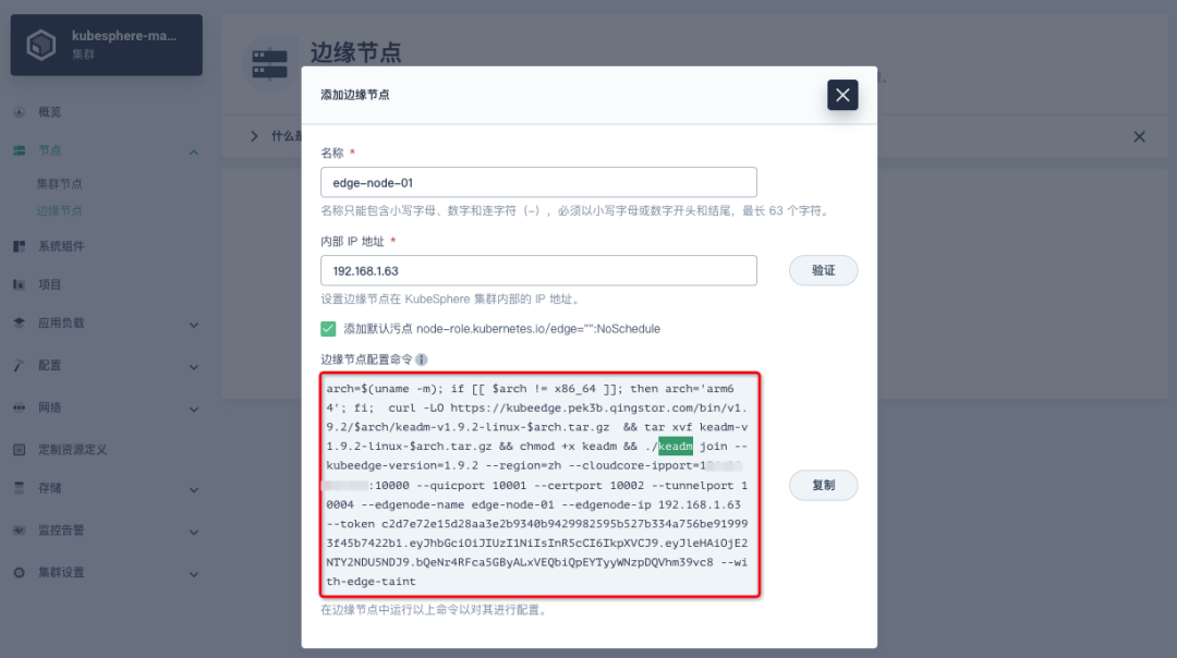 && chmod +x keadm && ./keadm join --kubeedge-version=1.9.2 --region=zh --cloudcore-ipport=1x.xx.xx.28:10000 --quicport 10001 --certport 10002 --tunnelport 10004 --edgenode-name edge-node-01 --edgenode-ip 192.168.1.63 --token c2d7e72e15d28aa3e2b9340b9429982595b527b334a756be919993f45b7422b1.eyJhbGciOiJIUzI1NiIsInR5cCI6IkpXVCJ9.eyJleHAiOjE2NTY2NDU5NDJ9.bQeNr4RFca5GByALxVEQbiQpEYTyyWNzpDQVhm39vc8 --with-edge-taint