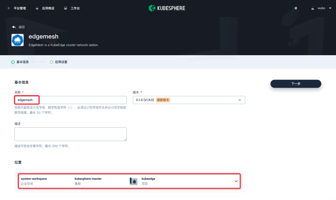 在该项目应用负载中创建基于模板的应用,选择从 " 应用商店 " 搜索找到 "edgemesh" 并点击安装,安装前请确认安装位置是否正确。
