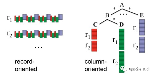 关系型数据的列式存储,可以将每一列的值直接排列下来,不用引入其他的概念,也不会丢失数据。关系型数据的列式存储比较好理解,而嵌套类型数据的列存储则会遇到一些麻烦。如图 1 所示,我们把嵌套数据类型的一行叫做一个记录(record),嵌套数据类型的特点是一个 record 中的 column 除了可以是 Int, Long, String 这样的原语(primitive)类型以外,还可以是 List, Map, Set 这样的复杂类型。在行式存储中一行的多列是连续的写在一起的,在列式存储中数据按列分开存储,例如可以只读取 A.B.C 这一列的数据而不去读 A.E 和 A.B.D,那么如何根据读取出来的各个列的数据重构出一行记录呢?