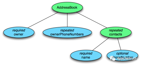 这个 schema 中每条记录表示一个人的 AddressBook。有且只有一个 owner,owner 可以有 0 个或者多个 ownerPhoneNumbers,owner 可以有 0 个或者多个 contacts。每个 contact 有且只有一个 name,这个 contact 的 phoneNumber 可有可无。这个 schema 可以用图 3 的树结构来表示。
