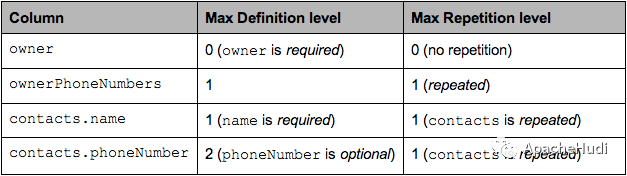 以 contacts.phoneNumber 这一列为例,"555 987 6543"这个 contacts.phoneNumber 的 Definition Level 是最大 Definition Level=2。而如果一个 contact 没有 phoneNumber,那么它的 Definition Level 就是 1。如果连 contact 都没有,那么它的 Definition Level 就是 0。