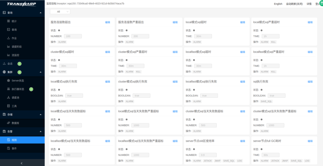 审计告警:支持监测安全侵害事件,如越权操作、非法入侵; 状态告警:支持对用户活动带来的异常状态告警,如慢查询过多、在线事务过多、连接数过多等;支持对数据库异常状态告警,如锁超时、相关服务不可用等; 资源预警:支持对资源情况预警,通过摘要模板,精确显示具体的告警对象,如某服务内存不足、某中间件CPU占用过高等;