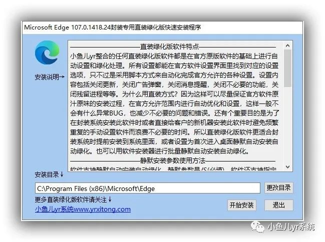 Microsoft Edge 封装专用直装绿化版支持静默自动安装自动绿化,静默参数是/S(必填)。软件还支持指定静默安装路径,路径参数是/P="软件安装路径"(选填)。列如:/S P="D:\Program Files (x86)\Microsoft Edge"。如果在封装系统时,想让软件首次进入桌面时智能选择最优化安装位置,可使用自动路径参数/P="auto"。列如:/S /P="auto"。此参数是让软件在任意硬盘分区的系统环境里自动判断硬盘类型和用户桌面位置,优先安装到固态硬盘或用户桌面所在的磁盘分区的程序目录里。如果要强制静默安装到用户桌面所在的磁盘分区的程序目录里,可以使用跟随桌面路径参数/P="desktop"。列如:/S /P="desktop"。自动路径参数和跟随路径参数建议配合ES5S封装工具或小鱼儿yr系统封装优化设置辅助工具的静默转移用户文档目录功能使用效果更佳。注意:所有字母不区分大小写。如果不带路径参数,则静默安装到默认目录。如果带路径参数,则必须配合/S一起使用,并且/S和/P之间有一个空格。软件安装路径必须写到/P=的等号后面,并且路径首尾必须加上英文状态下的双引号,否则如果安装路径里有空格的话会识别不了空格后面的字符,从而造成安装路径与实际路径不符。如果设置的安装路径目录不存在,则自动创建安装目录并安装。如果安装目录路径非法,则自动安装到默认路径(即C盘程序目录)。