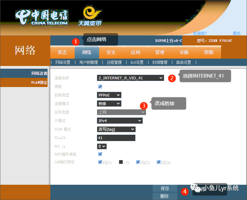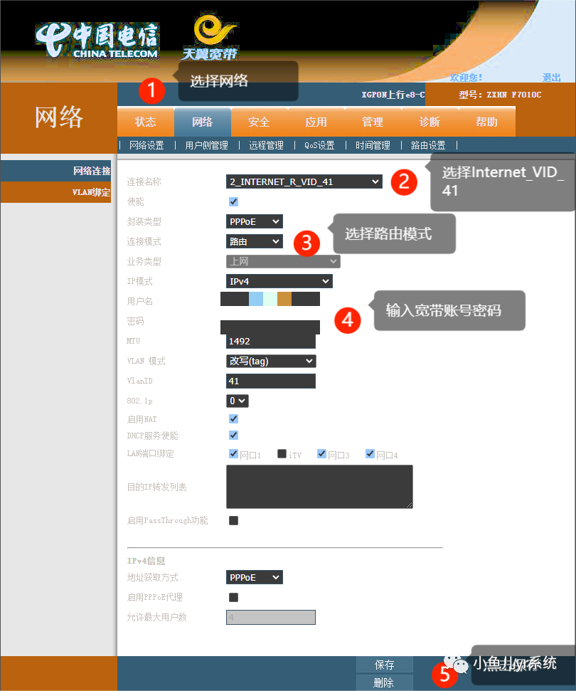 第二步:选择网络→选择Internet_VID_41→路由模式→输入宽带账号密码→点击保存