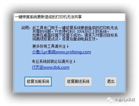 不过卸载补丁非常耽搁时间。所以我整合了一个一键修复最近出现的系统更新后无法共享打印机问题的工具。这个工具可以在线修复和离线修复,精简母盘时可以对挂载的母盘进行离线修复。本人最近精简的母盘就是用的这个工具离线修复的。