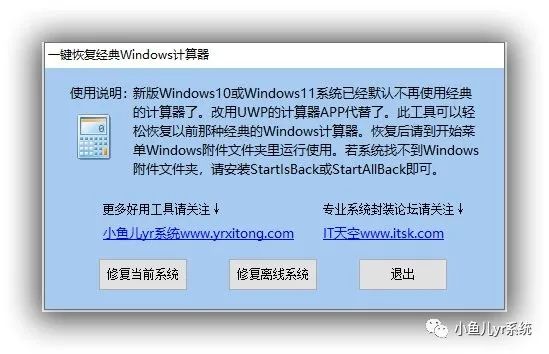 一键恢复经典Windows计算器可以轻松恢复系统里的老版本计算器。新版Windows10或Windows11系统已经默认不再使用经典的计算器了。改用UWP的计算器APP代替了。此工具可以轻松恢复以前那种经典的Windows计算器。恢复后请到开始菜单Windows附件文件夹里运行使用。