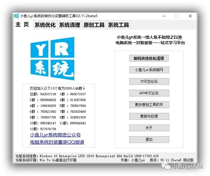 以后在更新最新版之前,我都会先在微信公众号提前两天透露一下更新的内容,并安排一下限时开放最新版本的限时下载时间,在限时开放分享的时间内大家可以回复公众号【小鱼儿yr系统封装优化设置辅助工具最新版】获取最新版本下载地址(注:其他时间回复只能获取上一个月的正式版下载地址)。不过错过限时开放时间也没关系,第二天我会在IT天空更新最新版本,大家可以前往IT天空下载。还可以反馈BUG,提交优化建议意见,优化经验,被采纳后也可以获取最新版本。即使没有反馈也没关系,一个月后就会公开分享最新版本了,然后我会开启下一个版本的更新进程。总结一下,只要满足以下任意其中一点即可获取最新版本。6,使用本站分享的资源或镜像过程中遇到问题或BUG并反馈给我7,关于NTLite拼团和获取辅助工具VIP永久内测资格以及系统封装学习SVIP资格公告https://www.yrxitong.com/h-nd-884.html8,新版本更新前都会提前在微信公众号限时开放最新版本下载测试资格。(回复公众号【小鱼儿yr系统封装优化设置辅助工具最新版】即可,具体开放时间会提前几天在微信公众号或者藏经阁公布)小鱼儿yr系统封装优化设置辅助工具历史版本下载地址